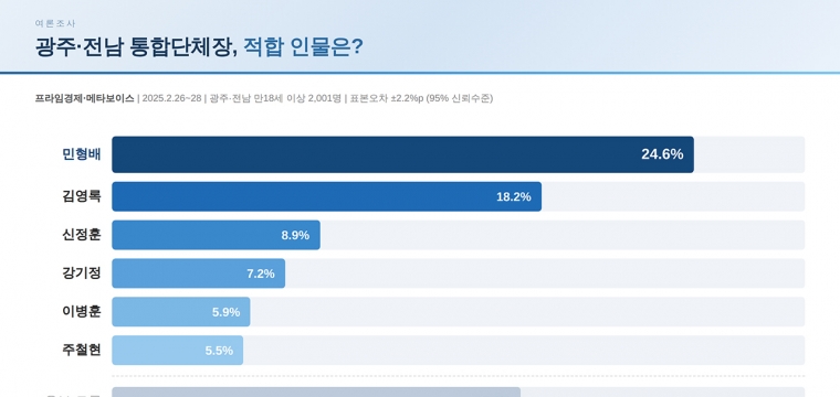 통합특별시장 적합도, 민형배 선두 굳히나2월 말 잇따라 실시된 통합특별시장 적합도 여론조사에서 민형배 국회의원이 김영록 전남도지사를 오차범위 밖으로 앞선 것으로 나타났다. 2월 초 조사에서 0.4%p 초접전을 벌였던 양강 구도에서 격차가 벌어진 수치다. 특별법이 지난 1일 국회 본회의를 통과하고 민주당 공관위가 2일 8인 경선을 확정하면서 통합시장 선거전이 본격화된 가운데 나온 결과여서 주목된다. 프라임경제가 메타보이스에 의뢰해 2월 26~28일 광주·전남 거주 만 18세 이상 2,001명을 대상으로 실시한 조사에서 민형배 의원은 24.6%, 김영록 지사는 18.2%를 기록했다. 두 후보 간 격차는 ...