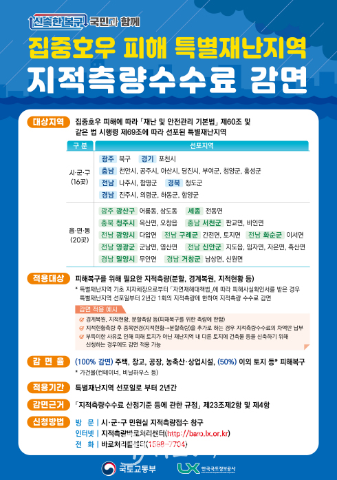 지원 대상은 한국국토정보공사(LX)에 지적측량을 의뢰하는 피해 주민으로 ‘피해사실확인서’를 제출하면 주거용 주택은 100%, 토지와 컨테이너, 비닐하우스 등 가설건축물은 50%를 감면받을 수 있다.