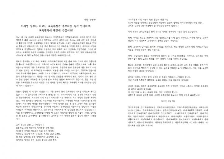 이재명 정부는 최교진 교육부장관 후보자를 즉각 임명하고, 교육개혁에 매진해 주십시오!