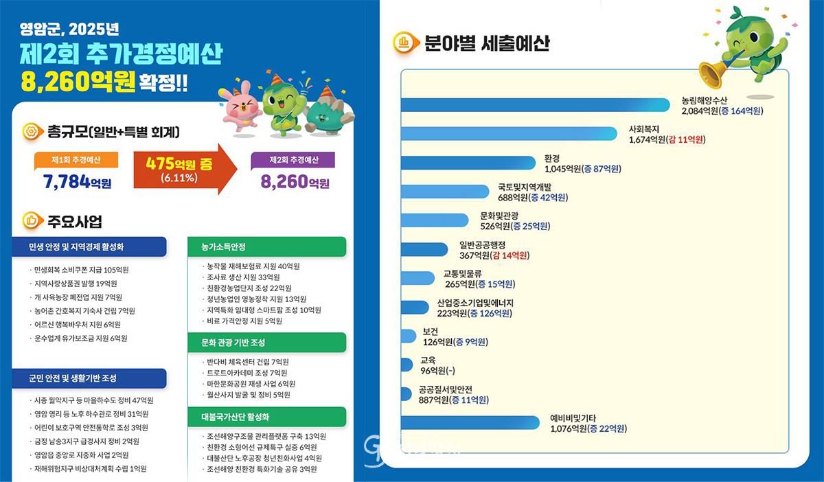 영암군(군수 우승희)이 5일 영암군의회 의결을 거쳐 425억원이 증액된 8,260억원 규모의 ‘2025년 제2회 추가경정예산’을 확정했다.