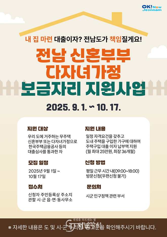 전라남도가 무주택 신혼부부와 다자녀가정을 대상으로 주택 구입 대출이자를 월 최대 25만 원씩 3년간 지원한다. 신청 기간은 10월 17일까지다.