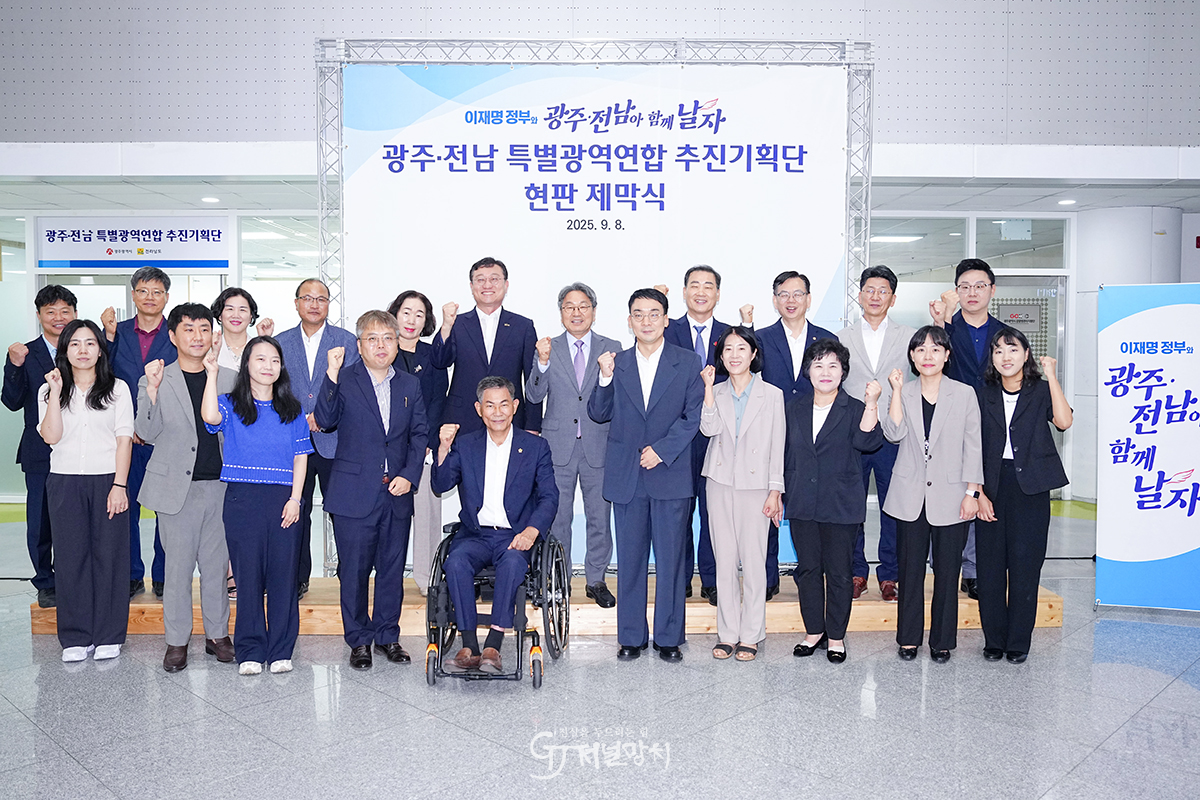 광주시와 전남도는 8일 광주시청에서 ‘광주·전남 특별광역연합 추진기획단’ 현판 제막식을 개최했다. 이날 행사에는 강기정 광주시장, 명창환 전남도 행정부지사, 서용규 광주시의회 부의장, 이광일 전남도의회 부의장 등이 참석했다.