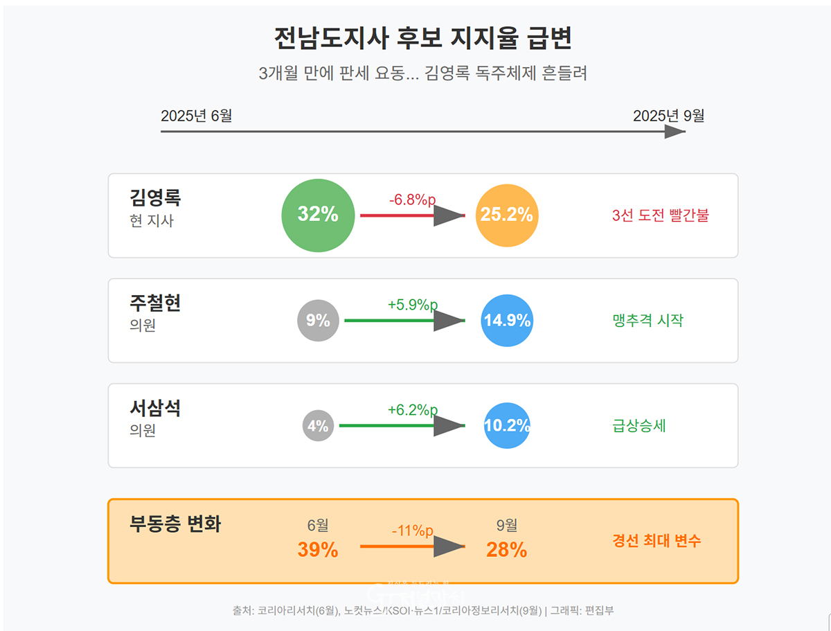 김영록 지사는 3선 도전이라는 부담과 함께 세대교체 요구에 직면해 있다. 반면 주철현, 서삼석 등 도전자들은 상승세를 이어가며 추격에 나서고 있다.