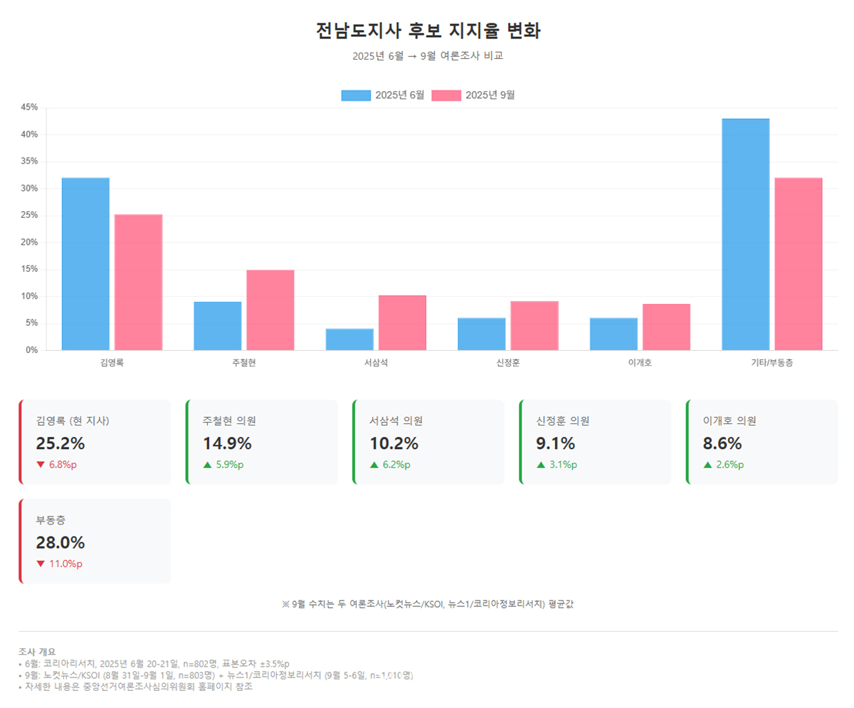 - 코리아리서치(6월): 2025년 6월 20~21일, 전남 거주 18세 이상 802명, 전화면접, 응답률 17.2%, 표본오차 ±3.5%p(95% 신뢰수준)