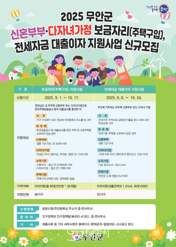 무안군(군수 김산)이 신혼부부와 다자녀가정의 주거비 부담을 줄이고 안정적인 정착을 돕기 위해 ‘전세자금 및 주택구입 대출이자 지원사업’을 본격 추진한다.