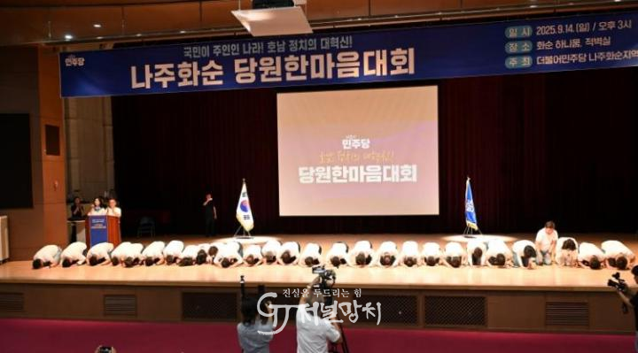 ![]() 신정훈 위원장과 윤병태 나주시장, 구복규 화순군수, 오형열 화순군의장과 나주시의원, 화순군의원 등이 당원을 향해 큰절을 올리고 있다. |