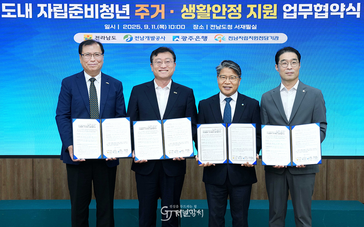 전남도는 지난 11일 도청 서재필실에서 전남개발공사, 광주은행, 전남자립지원전담기관과 자립준비청년 주거·생활 안정 지원 업무협약을 체결했다고 밝혔다. 협약식에는 명창환 전남도 행정부지사, 장충모 전남개발공사 사장, 김종훈 광주은행 부행장, 문성윤 전남자립지원전담기관장이 참석했다.
