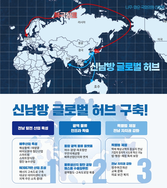 신 의원이 제시한 초광역 물류허브 구상은, 전남의 여수‧광양‧목포항과 무안국제공항을 연계해 신남방 글로벌 물류 플랫폼을 구축하고, RE100 산업단지와 에너지고속도로 등 친환경 첨단산업 인프라로 배후산업을 육성하는 방안이다. 여기에 더해, 지역 주도의 창의적 혁신이 가능하도록 법‧행정‧재정적 특례를 보장하는 특별법 제정도 포함하고 있다.