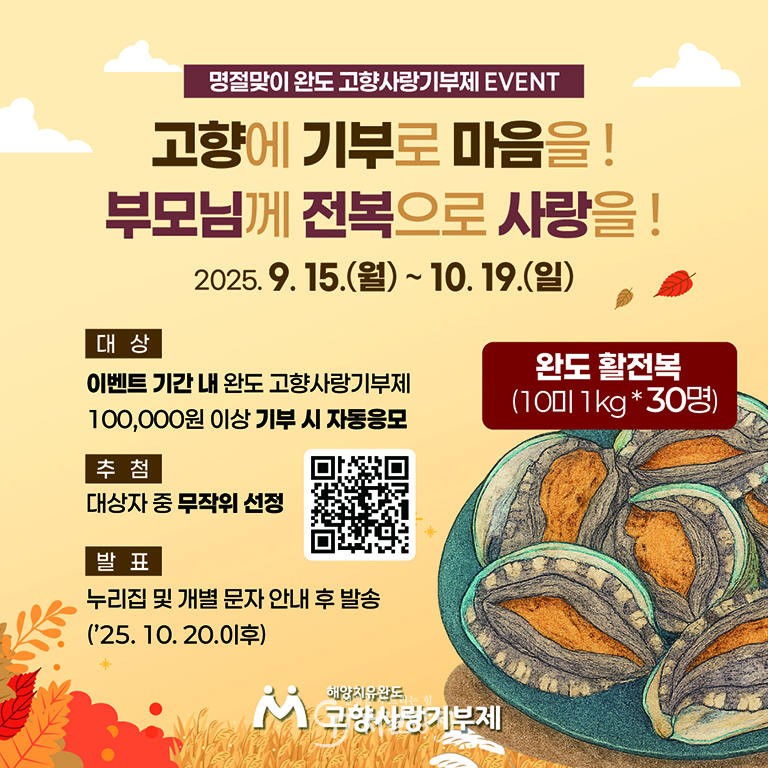 이벤트는 완도에 10만 원 이상 기부하면 자동 응모되며 기부자 중 추첨을 통해 선정된 30명에게 활전복(10미, 1kg)을 증정한다.