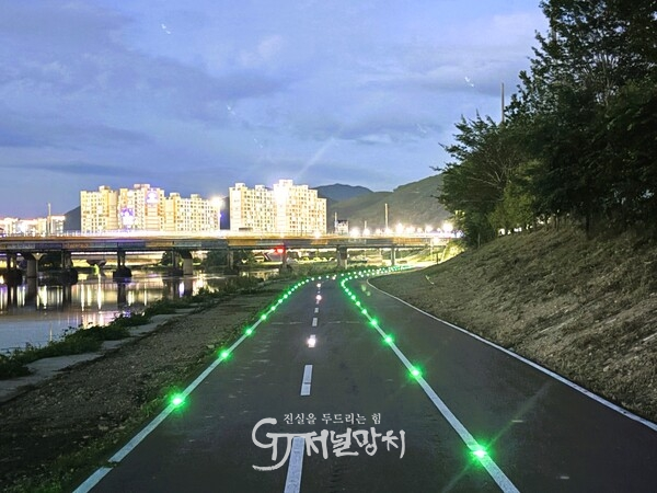 장성군 황룡강 자전거길에 야간조명 ‘반짝’… 안전 확보 이미지 1장성군이 자전거 이용자 안전 확보를 위해 황룡강변 자전거도로에 ‘활주로형 엘이디(LED) 표지병’을 설치했다.