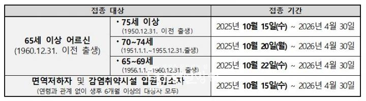 이번 접종은 상대적으로 질병 부담이 큰 고위험군을 대상으로 하며, 65세 이상 어르신과 생후 6개월 이상 면역저하자, 감염취약시설(요양병원, 요양시설, 정신건강증진시설, 노숙인 생활시설, 장애인 생활시설) 입원·입소자가 포함된다.