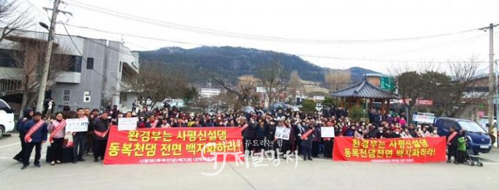 ![]() 지난 2월 사평댐 전면 백지화 궐기대회를 진행하고 있는 모습. |