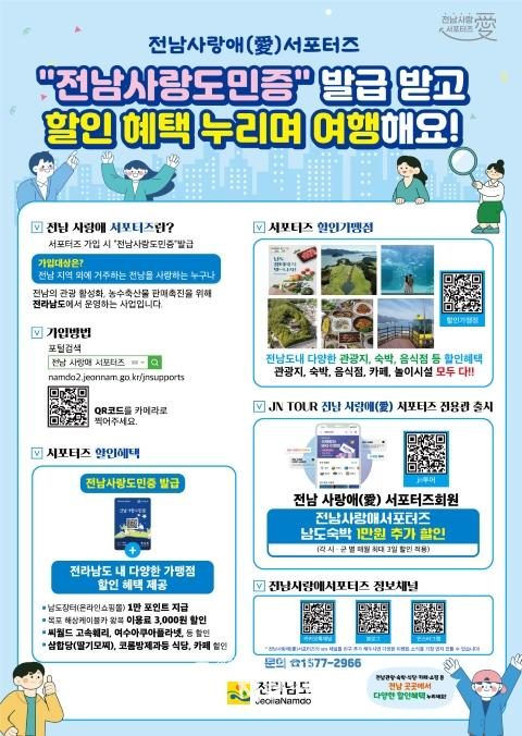 전남 사랑애 서포터즈는 지역 소멸 위기를 극복하고 농특산물 판매 촉진, 관광 활성화를 위해 지난 2022년 9월부터 운영되고 있다. 가입자에게는 전남 도내 관광지, 숙박, 음식점, 전통시장 등 할인가맹점에서 할인 혜택을 받을 수 있는 ‘전남사랑도민증’이 발급된다.