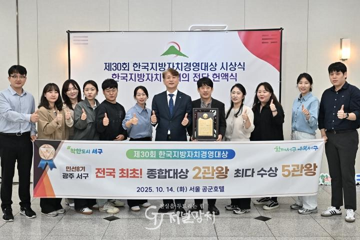 서구는 14일 서울 공군회관에서 열린 (재)한국공공자치연구원 주관 제30회 한국지방자치경영대상 시상식에서 ‘종합대상’을 수상했다. 지난 2023년에 이어 올해도 종합대상을 수상함으로써 민선8기 최초 종합대상 2관왕의 기록을 세웠으며 ▲2023년 종합대상, 주민자치대상 ▲2024년 복지보건대상, 인재육성대상에 이어 올해 종합대상까지 더해 ‘최다 수상 5관왕’을 달성했다. 이처럼 한 임기 내 ‘전국 최초’이자 ‘최다 수상’의 기록을 세운 것은 한국지방자치경영대상 역사상 광주 서구가 유일하다.