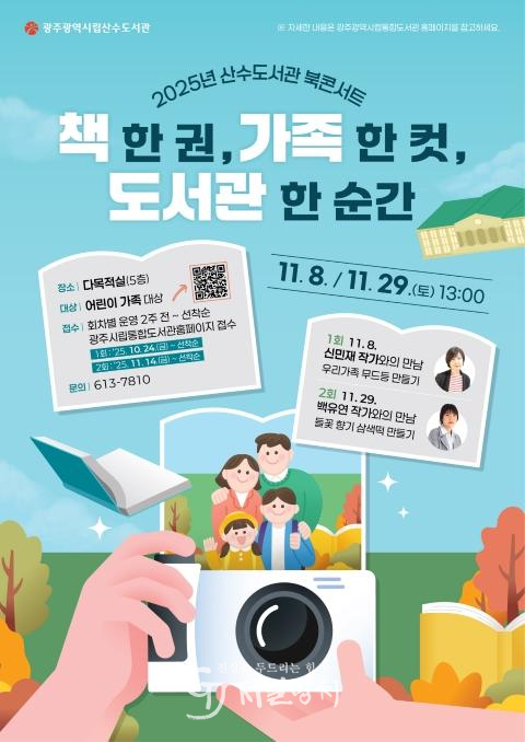산수도서관을 이용하는 어린이 가족은 누구나 참여할 수 있으며, 참가 신청은 10월 24일부터 광주시립도서관 누리집(citylib.gwangju.go.kr)을 통해 선착순(1회차-8일 15가족, 2회차-29일 12가족) 접수한다. 자세한 사항은 누리집을 참고하거나 산수도서관(613-7810)으로 문의하면 된다.