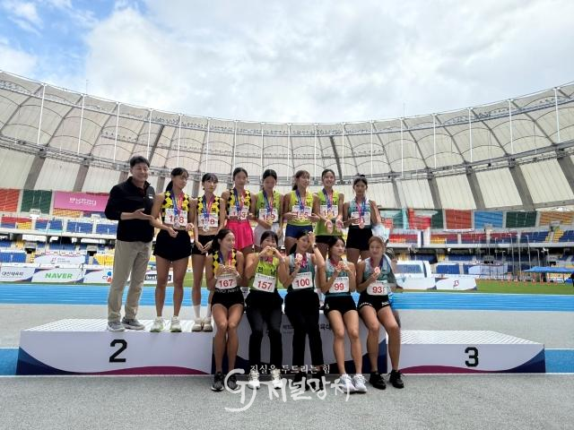 1600m 여자고등부 계주 금메달 수상 후 학생선수들이 기념사진 촬영을 하고 있다. |
