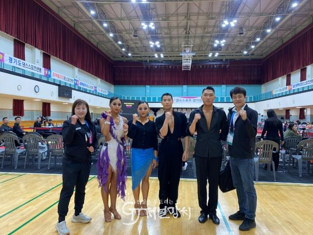 제106회 전국체육대회 댄스스포츠 종목에서 금메달 3개, 은메달 2개를 획득한 댄스스포츠 선수들이 단체사진을 촬영하고 있다. |