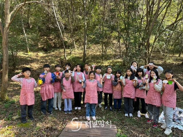 지난 22일, 4학년 학생들은 옥과면 묵은숲을 찾아 숲 속에서 미술 활동을 펼쳤다. 루페로 나뭇잎과 가지를 관찰하며 자연의 형태와 색을 세밀하게 살피고, 그 재료를 이용해 나뭇가지 액자와 잎 장식을 만들었다. 기다란 광목천 위에는 붓과 먹으로 자유롭게 그림을 그리고, 손바닥에 알록달록한 물감을 찍어 함께 표현하는 협동작업도 이어졌다.