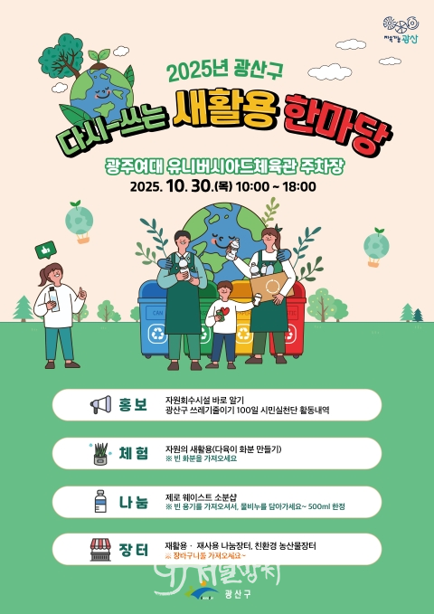 광산구 관계자는 “이번 한마당은 버려지는 자원을 다시 살리는 ‘새활용 문화’를 직접 느낄 수 있는 자리”라며 “시민이 즐겁게 참여하며 자원순환의 가치를 느낄 수 있는 계기가 되길 바란다.”고 전했다.