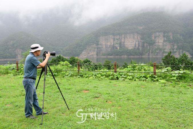 ![]() 아침 안개 낀 적벽을 촬영하고 있는 박철수 사진작가. /박철수 사진작가 제공 |