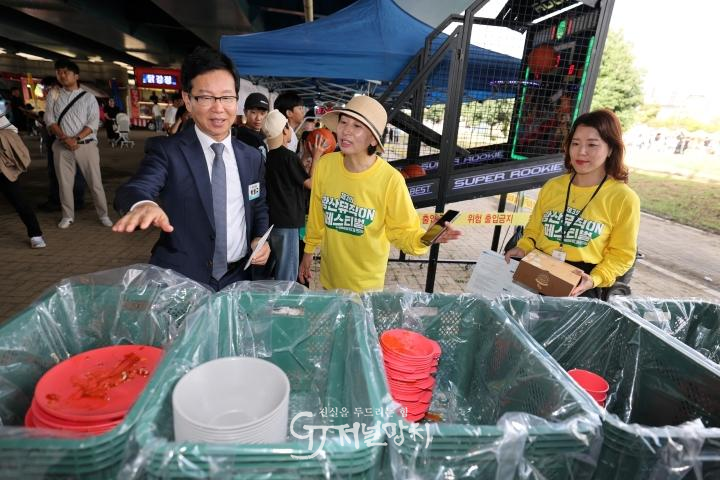 ![]() 박병규 광산구청장이 지난달 20일 열린 제3회 광산뮤직ON페스티벌에서 먹거리 공간에 비치된 다회용기를 점검하고 있다. /광산구 제공 |