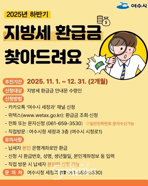 ![]() 여수시 ‘2025년 하반기 지방세 환급금 찾아주기 추진기간’ 홍보 포스터 /여수시 제공 |