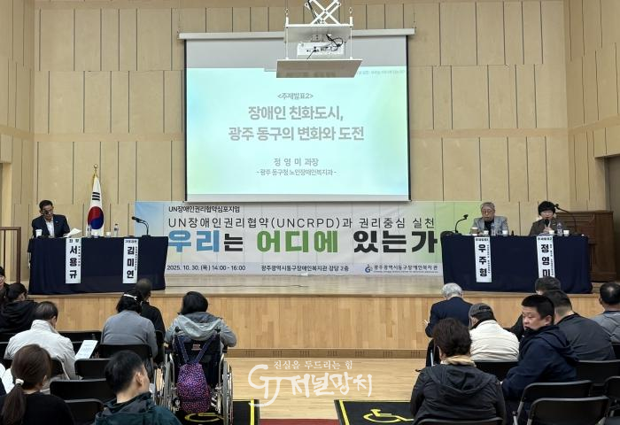 좌장은 서용규 광주광역시의회 부의장이 맡았으며, 김미연 UN 장애인권리위원회 위원장의 기조 강연을 시작으로 우주형 나사렛대학교 휴먼재활학부 교수와 정영미 노인장애인복지과장의 주제 발표 순으로 진행됐다.