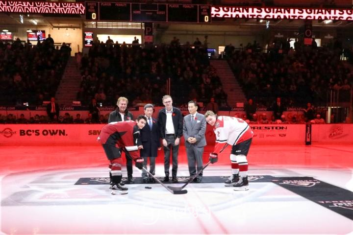 ‘퍽 드랍(Puck Drop)’은 캐나다 아이스하키 경기에서 가장 상징적인 개막 의식으로, 경기의 시작을 알리는 동시에 귀빈에게만 주어지는 명예로운 세리머니다. 양 도시 시장이 함께 퍽 드랍을 진행한 이번 장면은 국제우호도시로서의 첫 협력과 우정을 공식적으로 알리는 뜻깊은 순간으로, 경기장을 가득 메운 관중의 박수와 환호 속에 진행됐다.