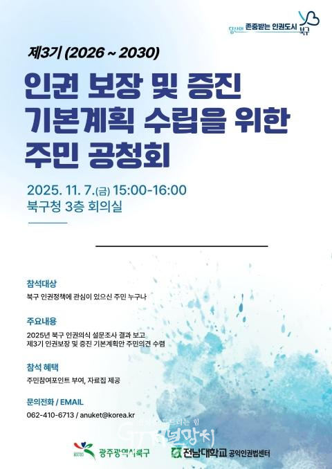 공청회에는 북구 인권위원회 위원, 명예 인권 요원, 인권 단체 관계자, 주민 등 100여 명이 참석하며 ▲2025년 북구 인권 의식 설문조사 결과 보고 ▲제3기 인권보장 및 증진 기본계획 연구용역 중간보고 ▲토론 및 자유발언 순으로 진행된다.