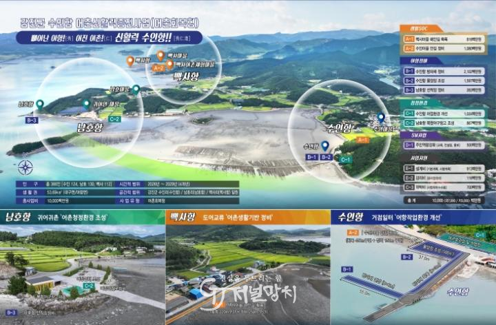 2026년 강진군 수인항 어촌신활력증진사업은 향후 4년간 국비 70억원을 포함한 총 100억원의 사업비가 투입된다. 배후마을의 생활여건개선을 위한 기초생활인프라 정비, 방파제와 물양장 등 어항시설 정비를 통한 안전한 어항시설 구축, 어구보관장과 작업공간 마련을 통한 깨끗하고 쾌적한 어업환경 조성을 목표로 추진될 예정이다.