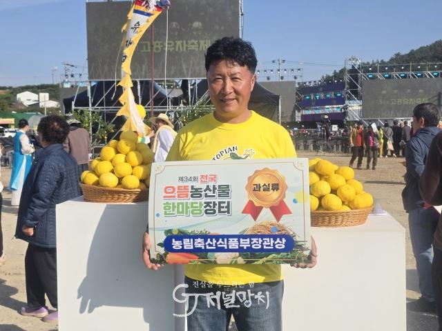 ![]() 제34회 전국으뜸농산물 한마당장터에서 농림축산식품부장관상을 수상한 이명현 씨가 고흥유자축제장에서 기념촬영을 하고 있다. /고흥군 제공 |
