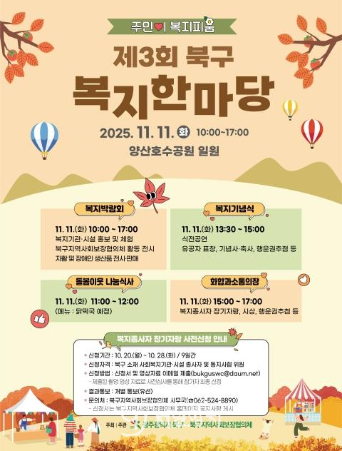 올해로 3회째를 맞는 ‘복지한마당’은 북구 지역사회보장협의체의 주관으로 ▲복지 박람회 ▲돌봄이웃 나눔식사 ▲기념식 ▲화합과 소통의 장 순으로 진행된다.