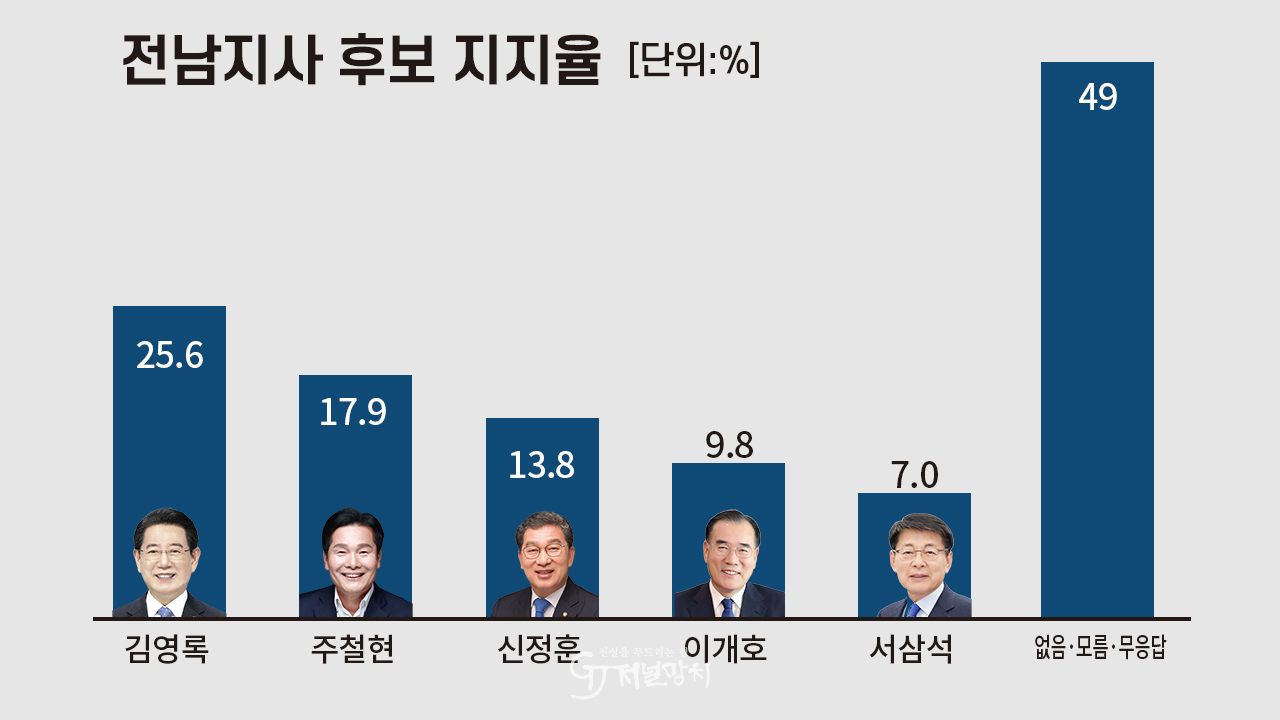 6월 조사(코리아리서치)에서 김영록 지사는 32%로 2위 주철현(9%), 3위 신정훈·이개호(각 6%)를 압도했다. 8월 말 조사(남도일보/에스티아이)에서는 김영록 27.6%, 주철현 13.4%, 신정훈 11.7%를 기록했다.