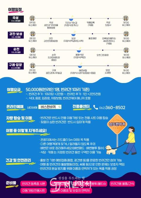 반려견 동반 여행코스는 11월 한 달 동안 금·토요일 총 4회 운영한다. 코스는 ▲14일 곡성- 섬진강 기차마을 동화정원과 도림사 ▲15일 강진·보성- 강진만생태공원과 율포해수욕장 ▲21일 순천- 드라마세트장과 오천그린광장 ▲22일 구례·담양- 섬진강대나무숲길과 담양 소쇄원이다.