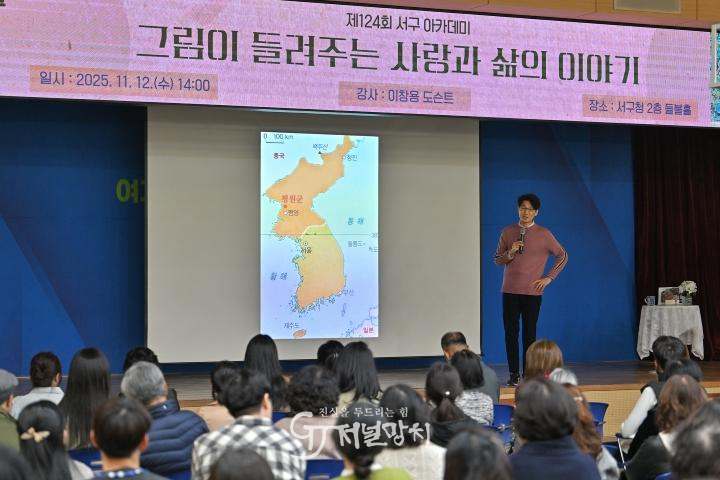 ![]() 광주 서구(구청장 김이강)는 12일 서구청 들불홀에서 이창용 도슨트를 초청해 ‘그림이 들려주는 사랑과 삶의 이야기’를 주제로 ‘제124회 서구 아카데미’를 개최했다. /광주 서구 제공 |