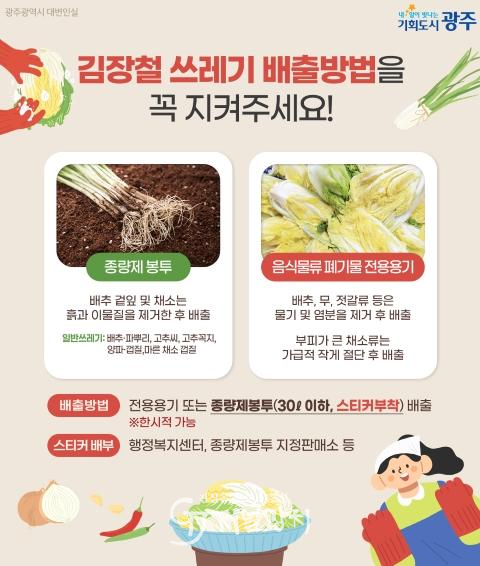광주시는 김장철 올바른 음식물쓰레기 배출을 위해 ▲배추·무·젓갈류는 염분을 제거하고 잘게 절단해 음식물류 폐기물 전용용기에 배출하고, ▲흙이 묻은 채소류는 이물질을 제거한 후 스티커를 부착한 종량제봉투에 배출할 것을 당부했다.