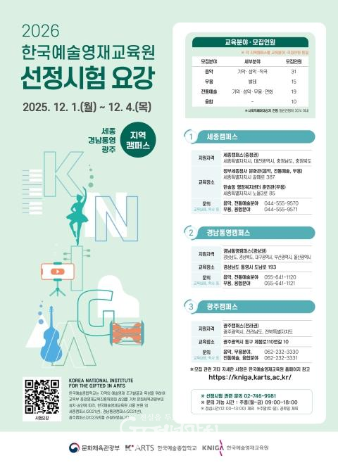 자세한 사항은 한국예술영재교육원 누리집(https://kniga.karts.ac.kr)을 참고하거나 한국예술영재교육원 교육지원팀(02-746-9981)으로 문의하면 된다.
