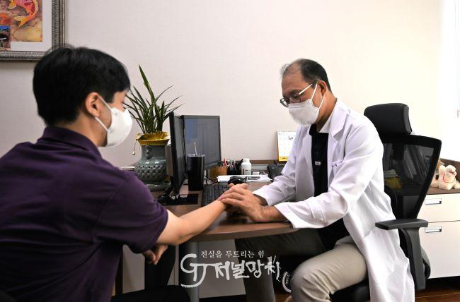 진료 중인 김남석 은산한방병원장(우). |