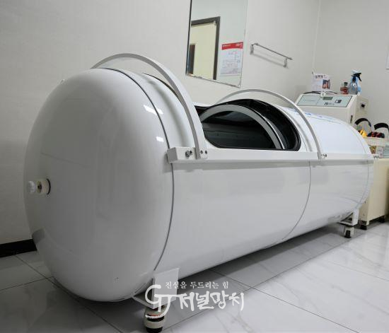 은산한방병원에서 환자 치료를 위해 쓰는 장비인 고압산소치료기 모습. 개인용 챔버에 누워 깨끗한 관을 통해 산소가 공급되고 서서히 압력이 상승한다. 고압산소치료로 호흡이나 피부를 통해 혈액 내 말초 혈관까지 산소가 전달된다. 신진대사 기능 활성화·항산화력 높여줌·혈액순환·뇌기능 향상·노화 방지와 피부 미용·파괴된 면역력 복원·암세포 증식 억제 등의 효과가 있다. |