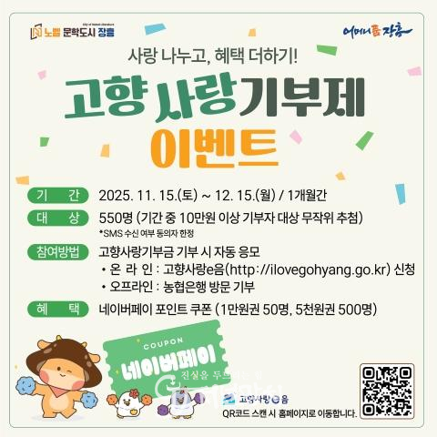 기간 내 장흥군에 기부한 참여자를 대상으로 추첨을 통해 총 550명에게 네이버페이 포인트 쿠폰을 증정하며 당첨자는 1만원권 50명, 5천원권 500명으로 결과에 따라 개별 안내될 예정이다.