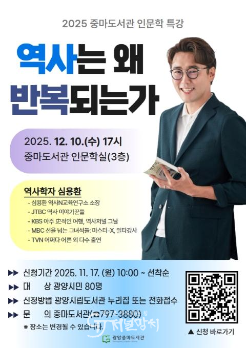 도서관은 이번 강의를 통해 역사의 반복 속에 담긴 인간과 사회의 본질을 되짚고, 오늘을 비추는 통찰을 시민들과 함께 나누며 올 한 해 이어진 인문학 여정을 의미 있게 마무리할 계획이다.