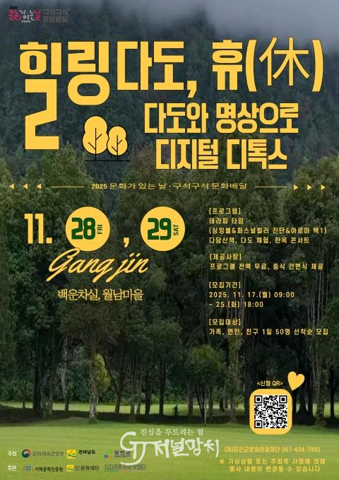 모집은 일별 선착순 50명으로 11월 17일 오전 9시부터 신청 가능하며, 자세한 내용은 강진군문화관광재단 공식 SNS에서 확인할 수 있다.