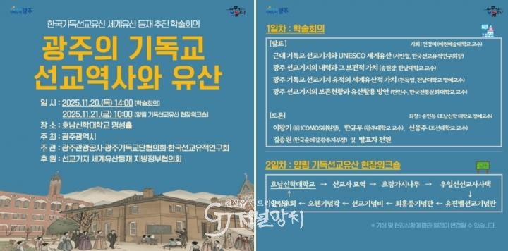 광주광역시(시장 강기정)는 오는 20~21일 호남신학대학교 일원에서 ‘한국기독선교유산 세계유산 등재 추진을 위한 학술회의와 워크숍’을 열어 한국 근대 기독교 선교의 역사적 가치를 조명한다.