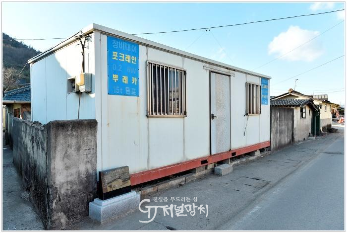 ![]() 표지석이 너무 작은 데다 골목에 놓여진 녹슨 철판 컨테이너 구조물 한 쪽에 바짝 붙여 세워진 표지석 |