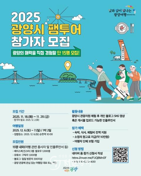 이현주 관광과장은 “2025 G-관광 팸투어는 낮과 밤이 빛나는 광양여행의 숨은 매력을 널리 알리고, 광양 관광 브랜드를 더욱 공고히 하기 위해 마련한 프로그램”이라며 “인터넷과 SNS에서 활발히 활동하며 창의적인 콘텐츠로 여행 트렌드를 이끄는 등 영향력을 발휘하고 있는 인플루언서들의 많은 관심과 참여를 기대한다.”고 말했다.