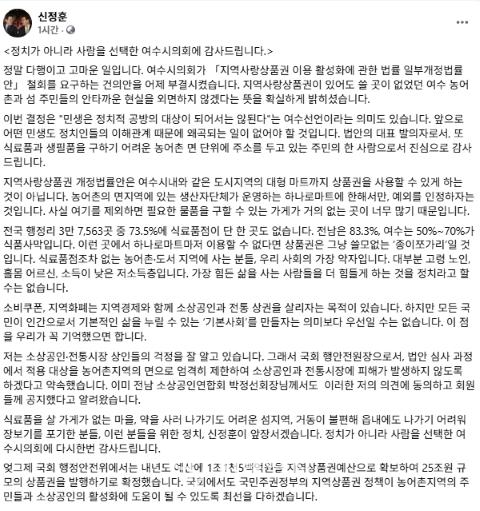 신 위원장은 21일 페이스북에 “여수시의회가 농어촌과 섬 주민들의 안타까운 현실을 외면하지 않겠다는 의지를 분명히 밝혀주셨다.”며 “민생은 정치적 공방의 대상이 되어선 안된다.”고 한 여수시의회의 선언에 대해 농어촌 주민의 한 사람으로서 감사드린다고 밝혔다.