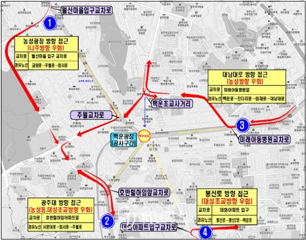 통제 구간 차량 우회도로는 ▲농성교차로에서 백운광장 방향 → 월산마을 입구 교차로에서 양궁장 방향 ▲광주대에서 백운광장 → 호반힐하임 교차로에서 양궁장 방향 ▲남광주(봉선·방림)에서 백운광장 → 미래아동병원 교차로에서 기독병원(수피아여고) 방향 ▲봉선동에서 백운광장 방향 → 대화아파트 입구 교차로에서 봉선중앙로(봉선초교) 방향 등이다.