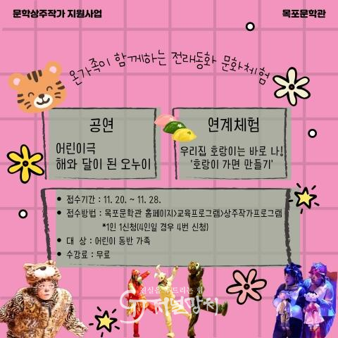 목포시 관계자는 “전래동화를 기반으로 한 공연과 체험을 통해 가족이 함께 공감하고 즐길 수 있는 문학문화 체험 기회를 마련하고자 했다.”며 “지역 어린이와 가족들의 많은 관심과 참여를 바란다.”고 전했다.