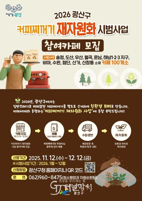 ‘커피 찌꺼기 재자원화 시범사업’은 생활폐기물과 탄소 배출을 줄이기 위해 마련됐으며, 커피전문점에서 배출되는 커피 찌꺼기를 친환경 퇴비로 재자원화하는 사업이다. 시범 사업 대상 지역은 △송정 △도산 △우산 △월곡 △비아 △첨단 △신가 △운남 △신창 △수완 △하남1·2·3 지구이다.
