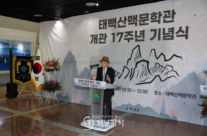 ![]() 조정래 작가가 태백산맥문학관 개관 17주년 개관식에서 인사말을 전하고 있다. /보성군 제공 |